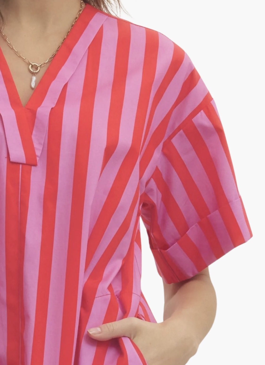 Solid two-tone stripe short sleeve midi dress featuring V-neckline. Side pockets. Lined.